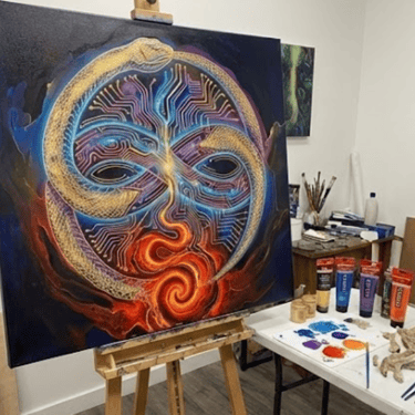 The Ouroboros, ancient, cyclic, frightening to the uninitiated. The Interpretation: This was not about external danger; it was a technical readout of my own energy system. It represents the Kundalini force, the raw, evolutionary energy coiled at the base of the spine that must be awakened and recycled continuously. The painting captures the exact moment I understood that fear and power are the same energy, just vibrating at different frequencies.
